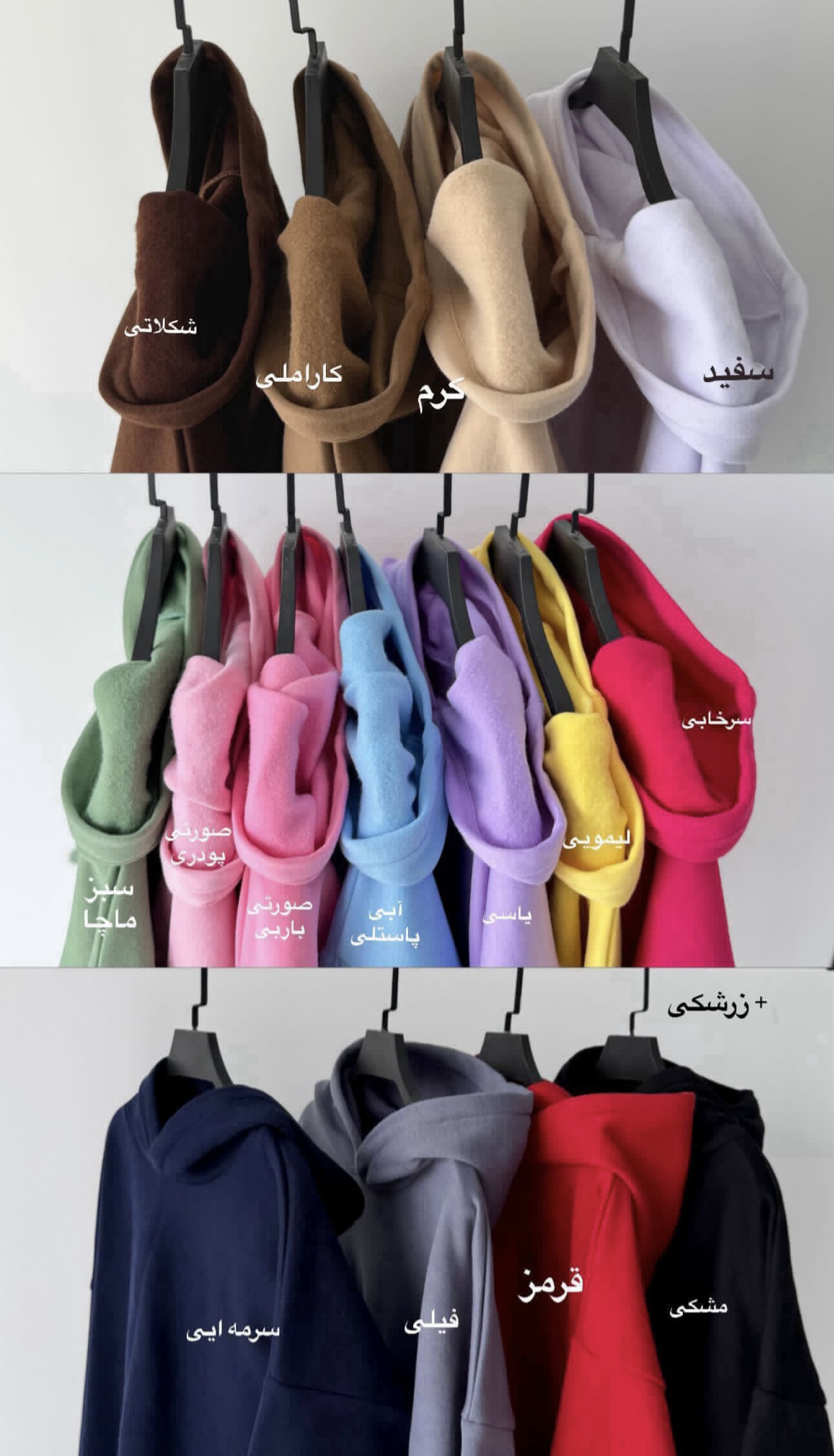 آبی پاستلی ,زرشکی ,سبز ماچا ,سرخابی ,سفید ,سورمه ای ,شکلاتی ,صورتی باربي ,صورتی پودری ,فیلی ,قرمز ,کرم ,کرم کاراملی ,لیمویی ,مشکی ,نارنجی |